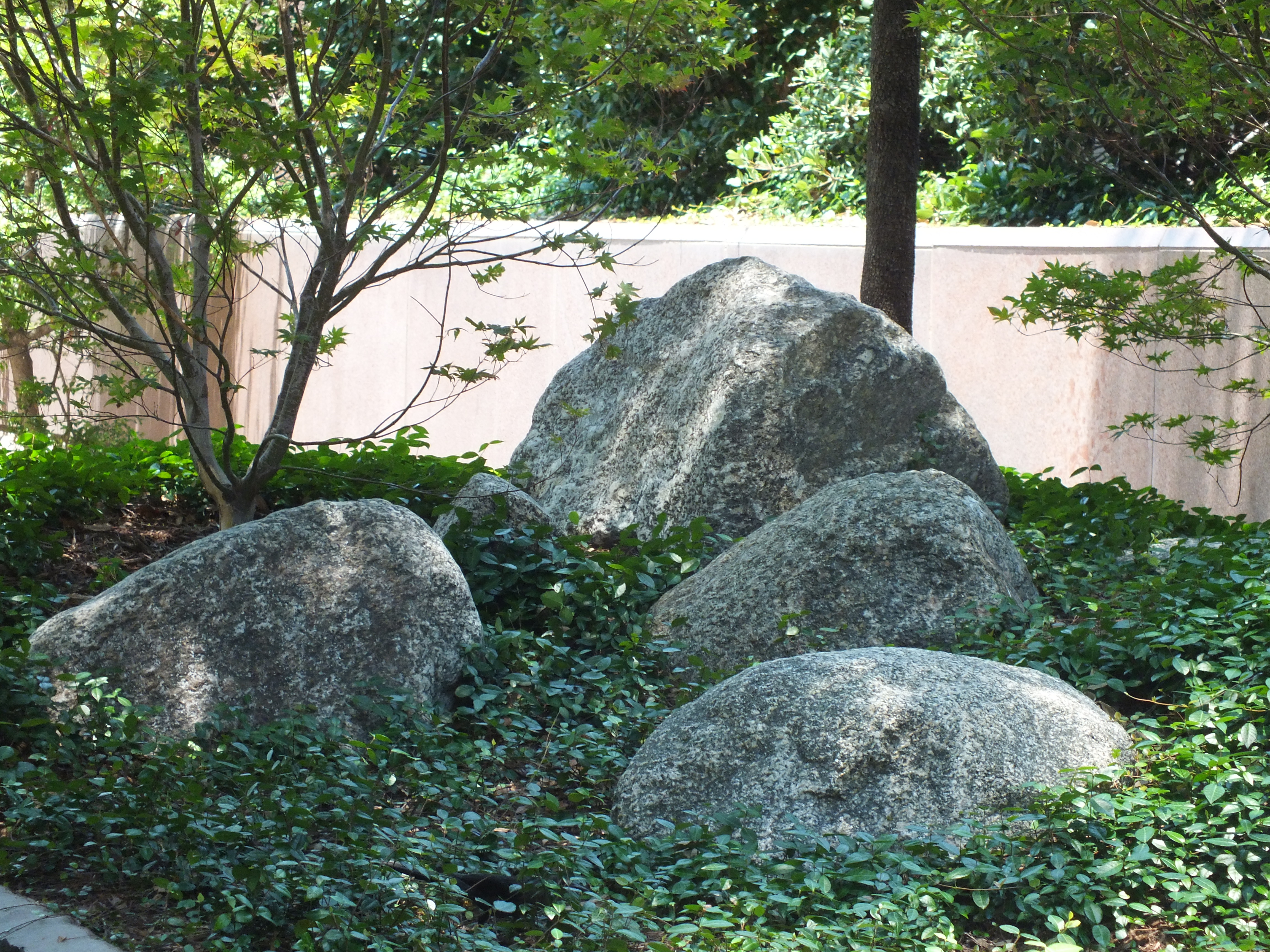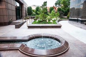 A modern take on the Japanese stroll garden is forming around the plaza level of the Trammell Crow Center in the art district of Dallas. Designed to expand the footprint of the Crow Collection of Asian Art, a free museum across the street from the Nasher Sculpture Center, this garden shows a different aspect around each side of the building. One side of the building features a stone arrangement, another a dry riverbed, another a shady grove or bamboo thicket, yet another a karesansui or flat landscape traditionally with raked gravel.