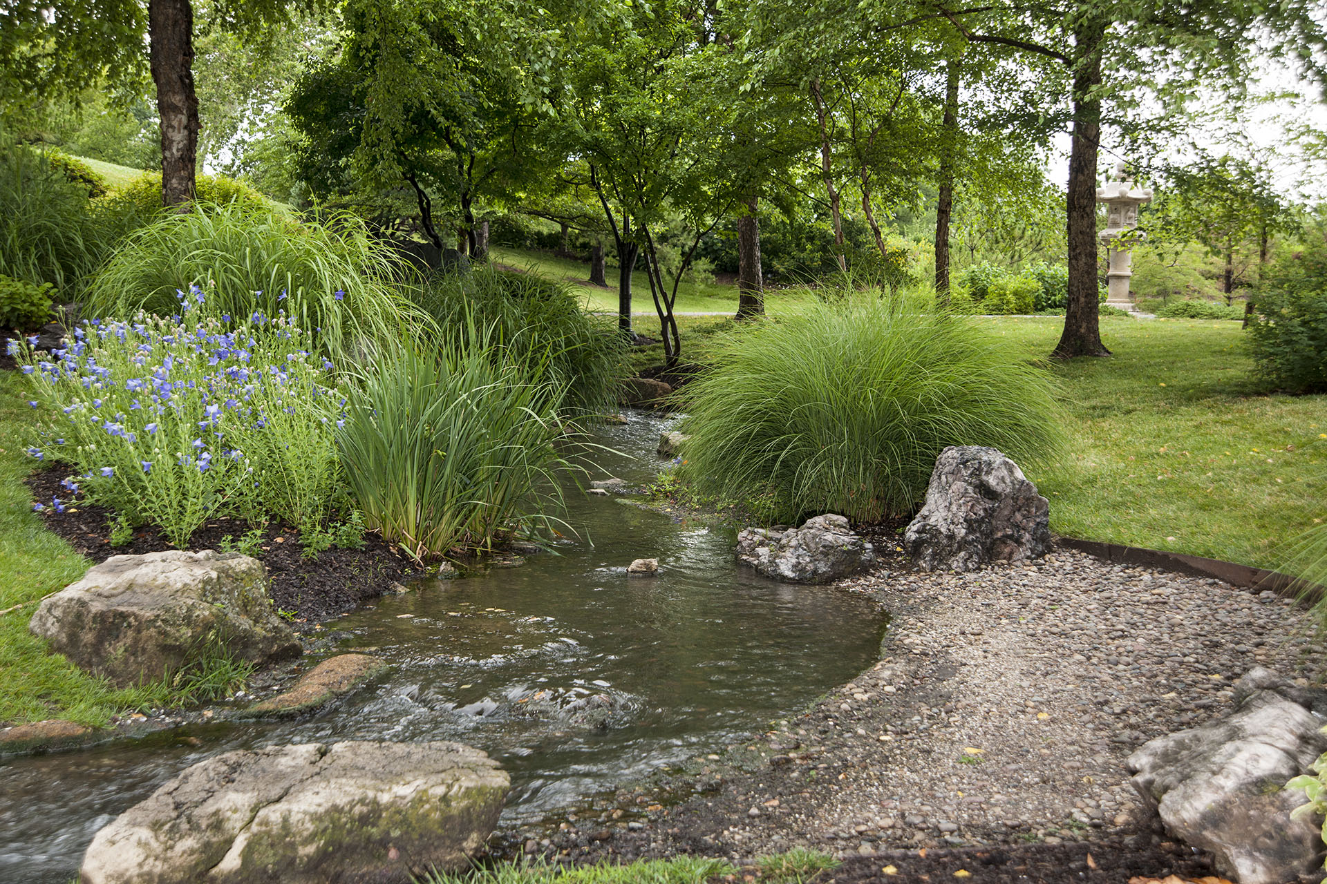 and the stream empties into the large reflecting pond with an island that holds a tea house for special occasions