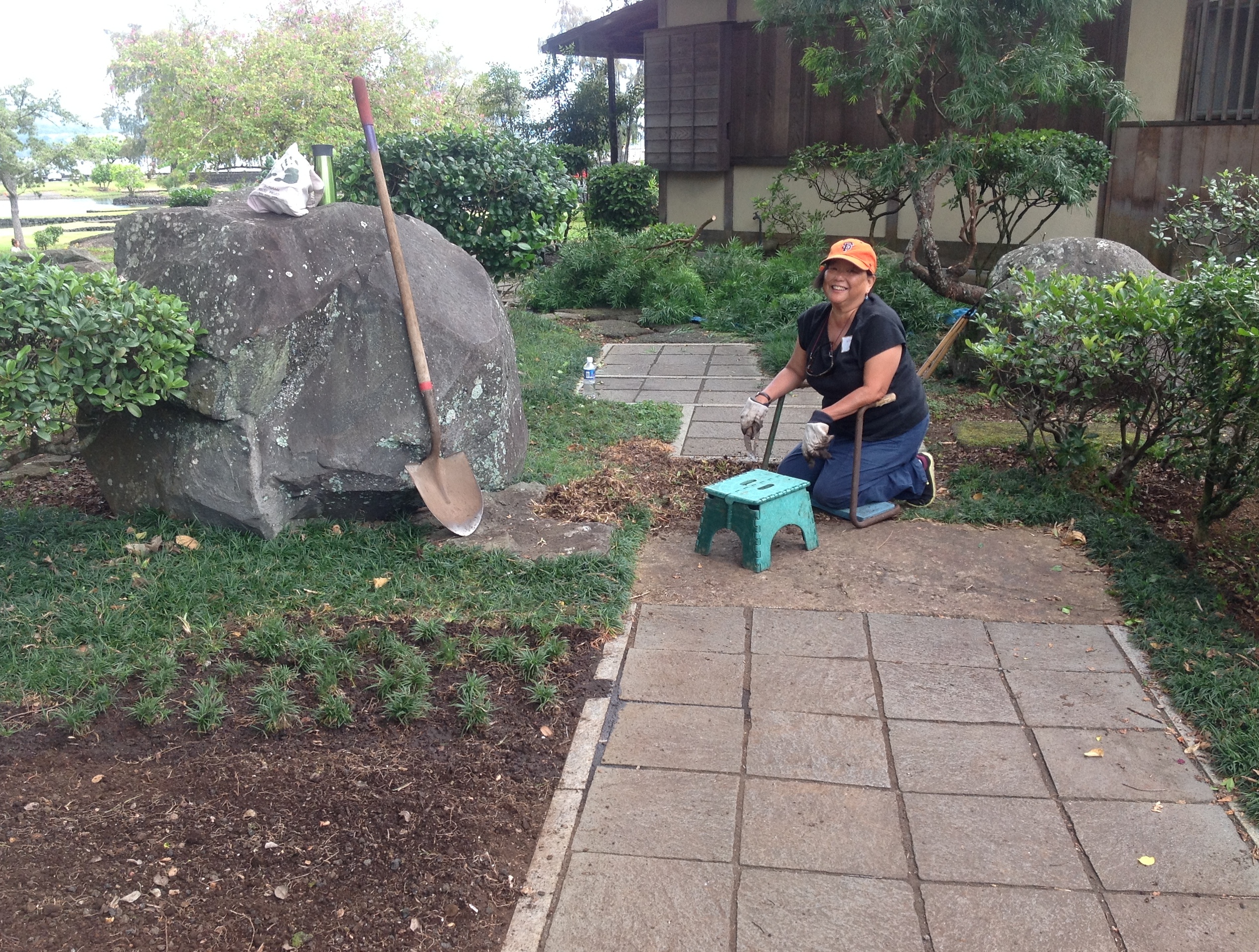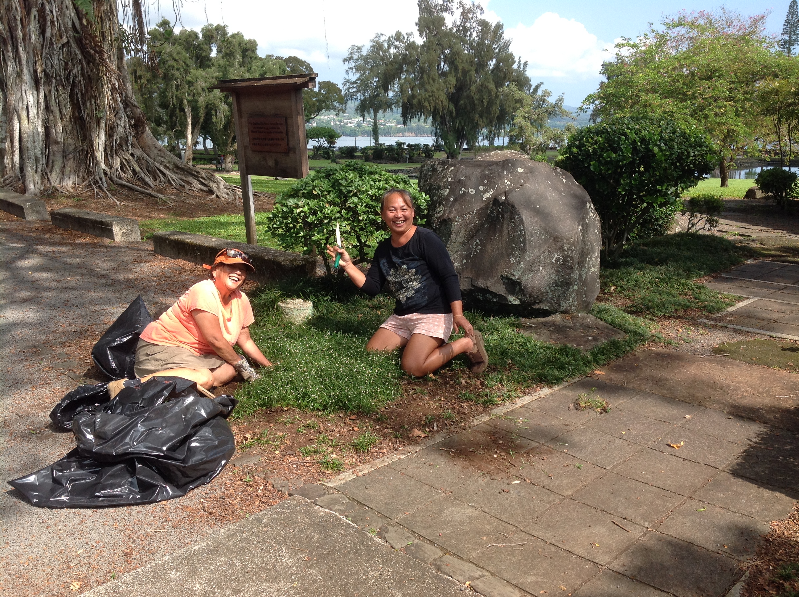 Friends of Lili`uokalani Gardens is helping the County to prepare for centennial celebrations in 2017. Volunteers have helped clear invasive seaweed from Waihonu, the pond at the heart of the garden. Other gifts of gratitude include trimming small trees, replacing dead bushes, fertilizing azalea and camellias, treating sago palms for cycad scale, and thinning the overgrown bamboo thicket, among others.