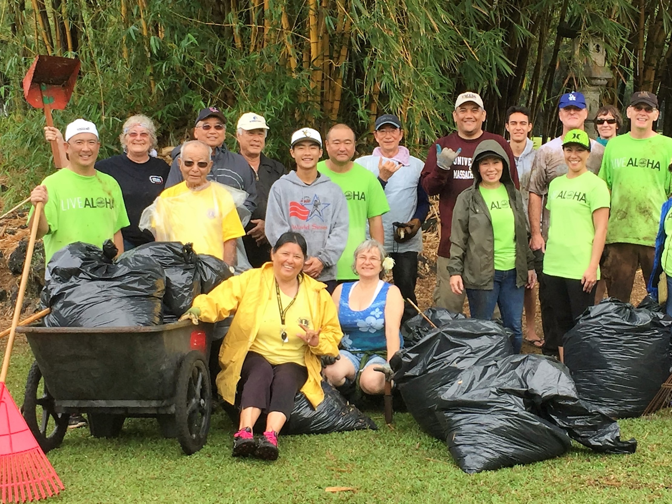 Mayor Billy Kenoi (center shaka with white ball cap) and his department heads and staff joined Sierra Club, Lions, Fukushima Kenjin Kai, and Friends of Lili`uokalani Gardens for spring cleaning at the bamboo patch.