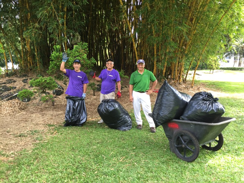 Yoshihisa Matsushita and Winston Towata of the Fukushima Kenjin Kai and Wally Wong of the Rotary Club of Hilo worked on the July 1, 2016 cleanup to prepare the area for the Fourth of July weekend and the Tanabata Festival the following weekend.