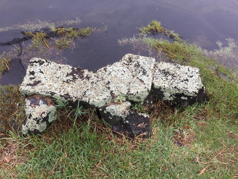 task: clean lichen off rock bench and remove surrounding weeds