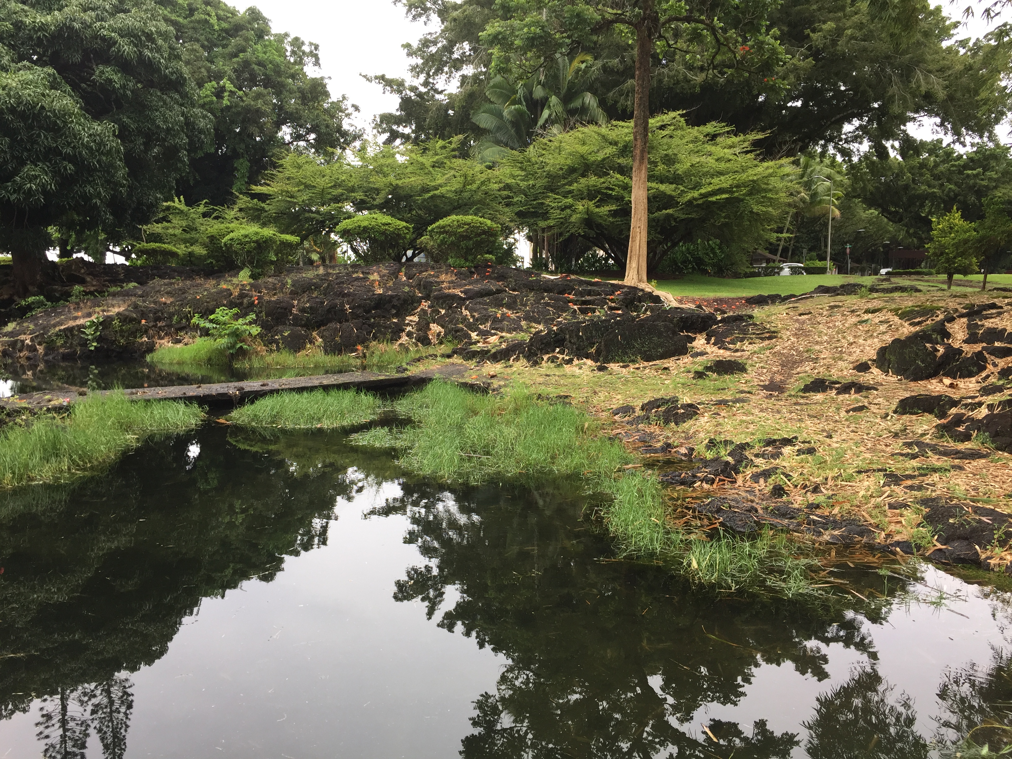 To the Banyan Drive side of the pond are two small spring-fed ponds choked with invasive seaweed, silt and weeds. The nearby lava outcroppings are covered with bamboo leaves.