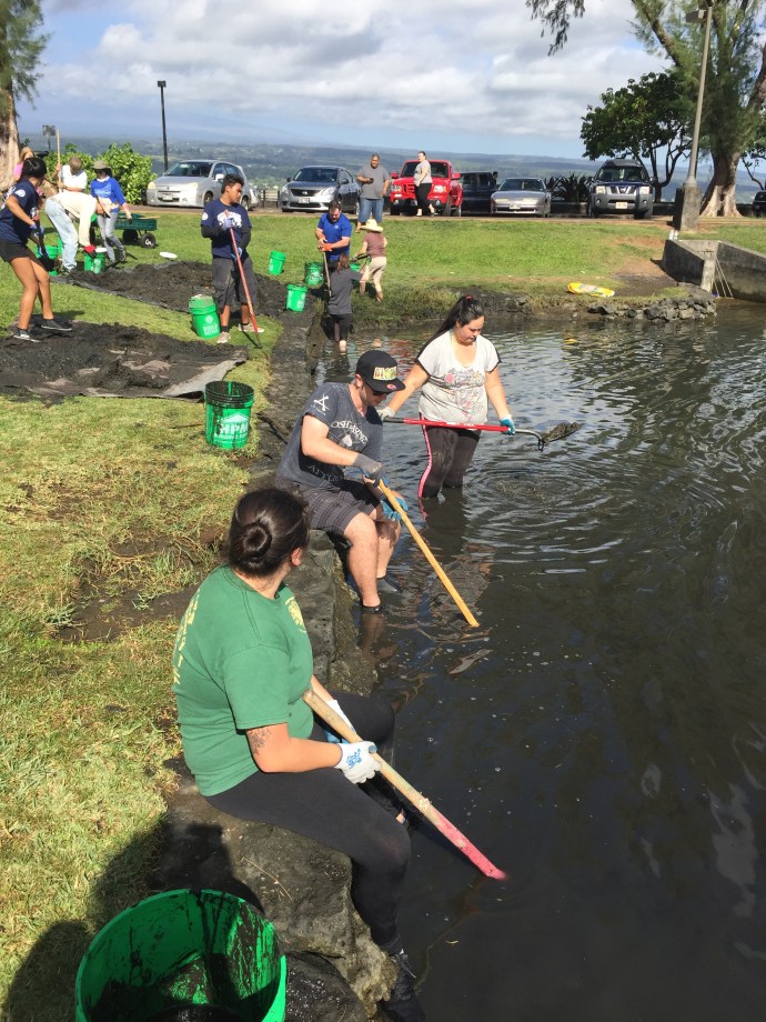 University of Hawaii-Hilo students, Hilo Y’s Men, and Representative Chris Todd join in the pond cleaning effort where the mud is de-watered before hauling to a nearby farm