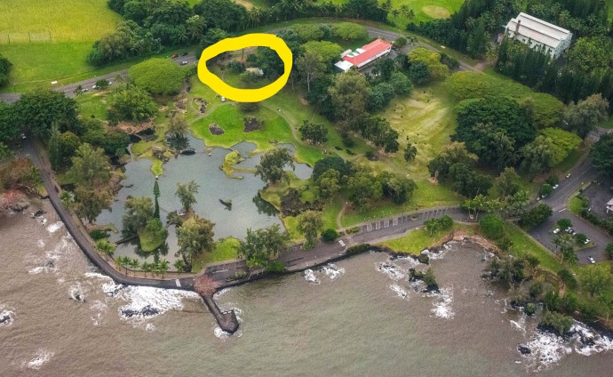 September 22 volunteers will meet at 8 a.m. in the old sumo ring near the small parking lot off Banyan Drive marked in this photo (aerial photo courtesy of 2017 calendar contest grand prize winner Kenneth W. Jackson and Paradise Helicopters)