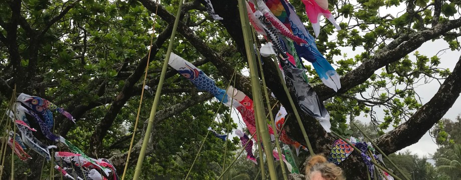 Koi nobori may be seen at Suisan Fish Market, Pandamonia’s Paleta Palace at Ali`i Ice, Lili`uokalani Gardens, Hilo Bay Cafe, Shoroan (the Urasenke tea house), Banyan Gallery, Castle Hilo Hawaiian Hotel, and the Grand Naniloa Resort among other Banyan Drive locations. The most colorful and abundant display will be on the bridge to Mokuola.