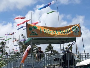 It was Kenji’s idea to fly koinobori for Children’s Day, for example. That idea grew this year to include all of Banyan Drive from Suisan Fish Market to Seaside Hotel with the most impressive display on the bridge from Kainehe to Mokuola. This year, Hawaiian fish were included with the Japanese carp windsocks.