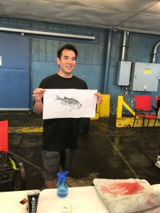 Brandon Tengan demonstrated gyotaku at Suisan.where the poke bombs were enjoyed by all.