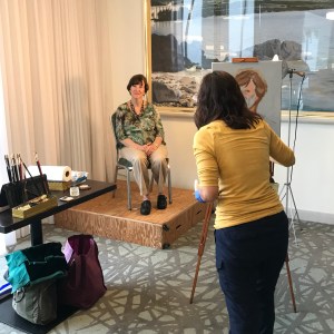 Dinnie Kysar won a drawing to have her portrait painted by Sakiko Shinkai in the Palm Room where the judged art works were displayed.