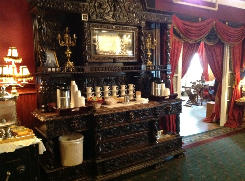 front parlor of the Queen Anne Bed and Breakfast Hotel on Sutter Street in San Francisco where coffee, tea and cold water are on hand 24/7