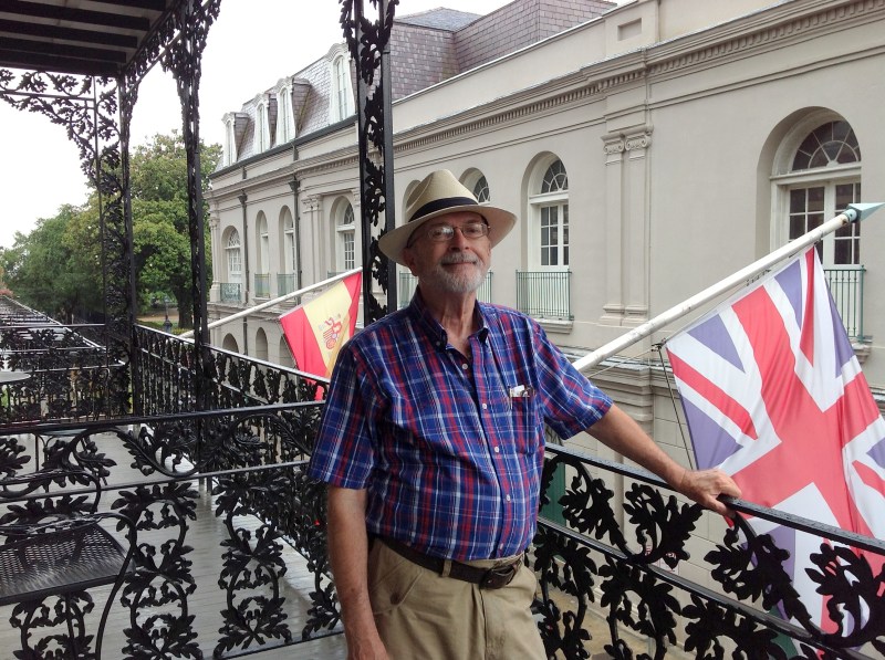 Bill with his new hat on the balcony outside room 301; Jackson Square trees visible one block behind him.
