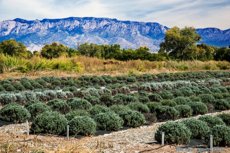 Looking across the lavender fields to the distant mountains at Los Poblanos