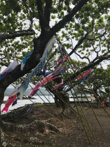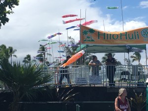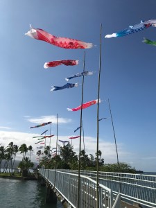 Koi nobori may be seen at Suisan Fish Market, Pandamonia’s Paleta Palace at Ali`i Ice, Lili`uokalani Gardens, Hilo Bay Cafe, Shoroan (the Urasenke tea house), Banyan Gallery, Castle Hilo Hawaiian Hotel, and the Grand Naniloa Resort among other Banyan Drive locations. The most colorful and abundant display will be on the bridge to Mokuola.